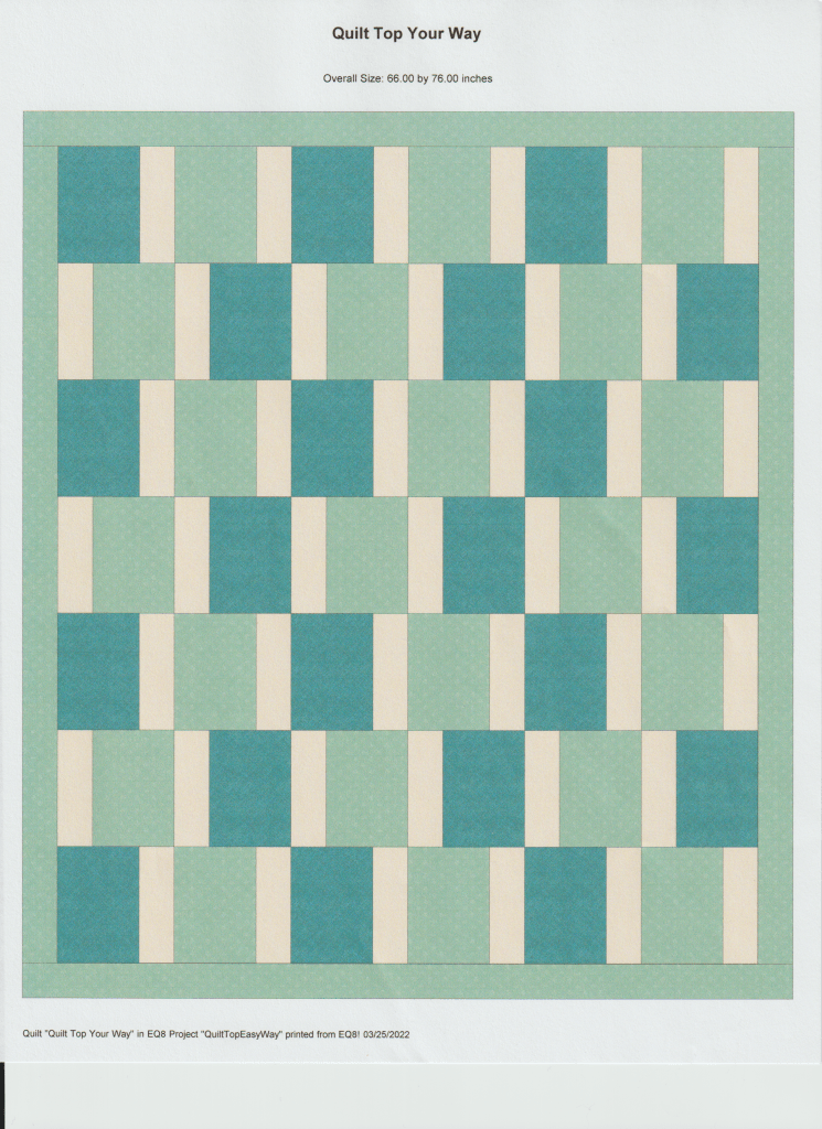 The Layer Cake is a package of 42 precut 10 inch squares of different patterned fabrics and colors. The Layer Cakes I have previewed are fabrics and colors that work well together with some complement and contrast colors combined. The pattern is cut to create two different sized rectangles. The small rectangle is a 3 inch by 10 inch rectangle and the larger piece is 7 inch by 10 inch. After cutting all your squares you can mix and match your pieces to create a 10 inch square. I like to pin my arranged pieces to the design board to preview the quilt before I sew. Also, if you have a plentiful stash of fabric, you can easily cut your own 10 inch squares and create a fabulous quilt. I have included the fabric names I used for the pattern and the yardage using 44-45 fabric width. So, maybe you can have your own “piece of cake” too!